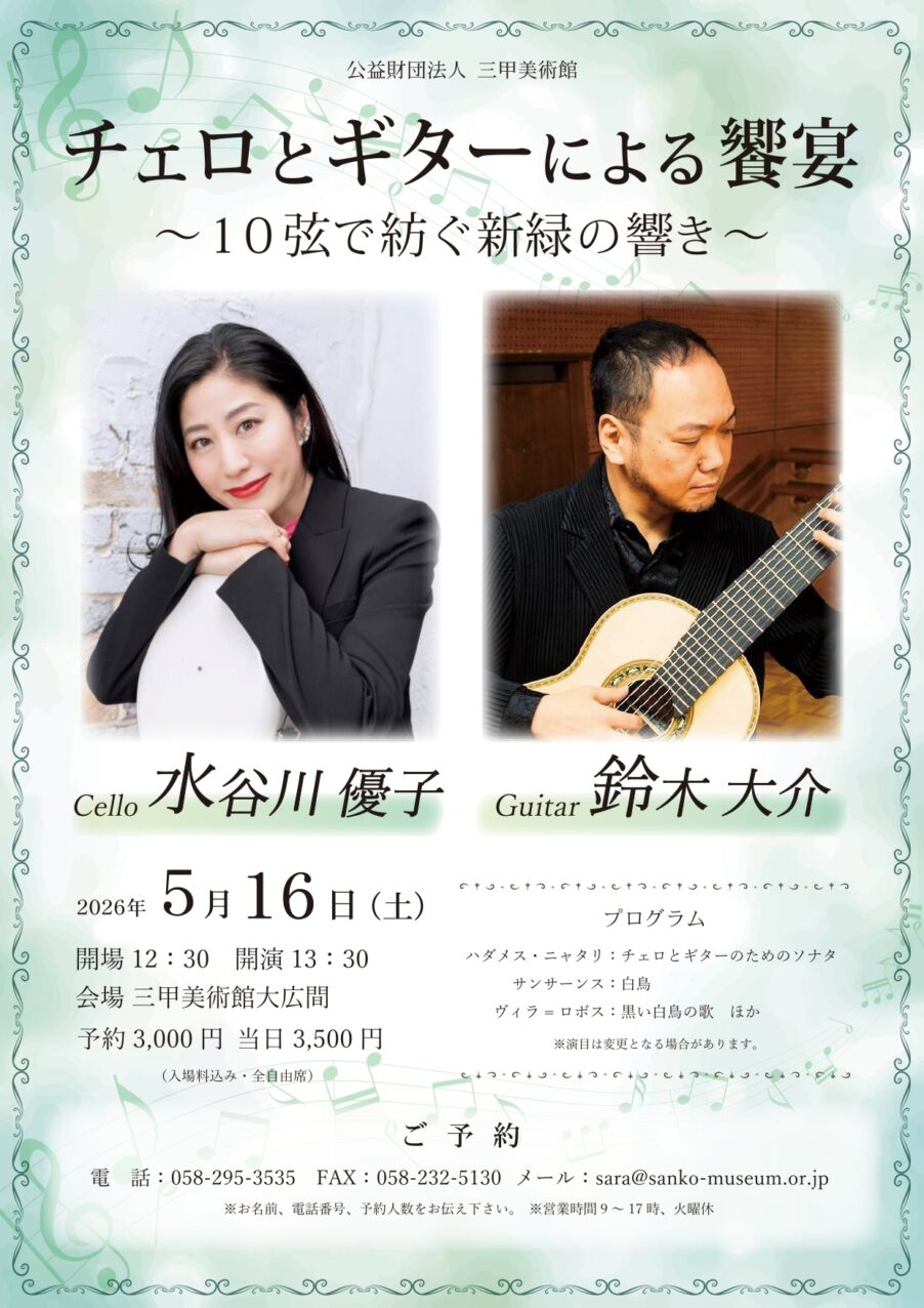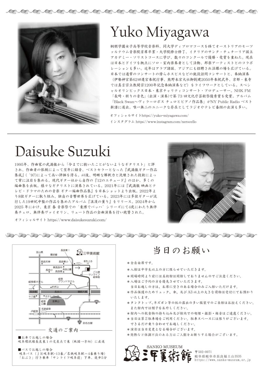 2025年11月30日(日)、12月5日(土)の催事にて当初告知しておりました「チェロ&ピアノコンサート/出演:水谷川優子(チェロ)、山本貴志(ピアノ)」は「チェロ&ギターコンサート」へ変更となりました。